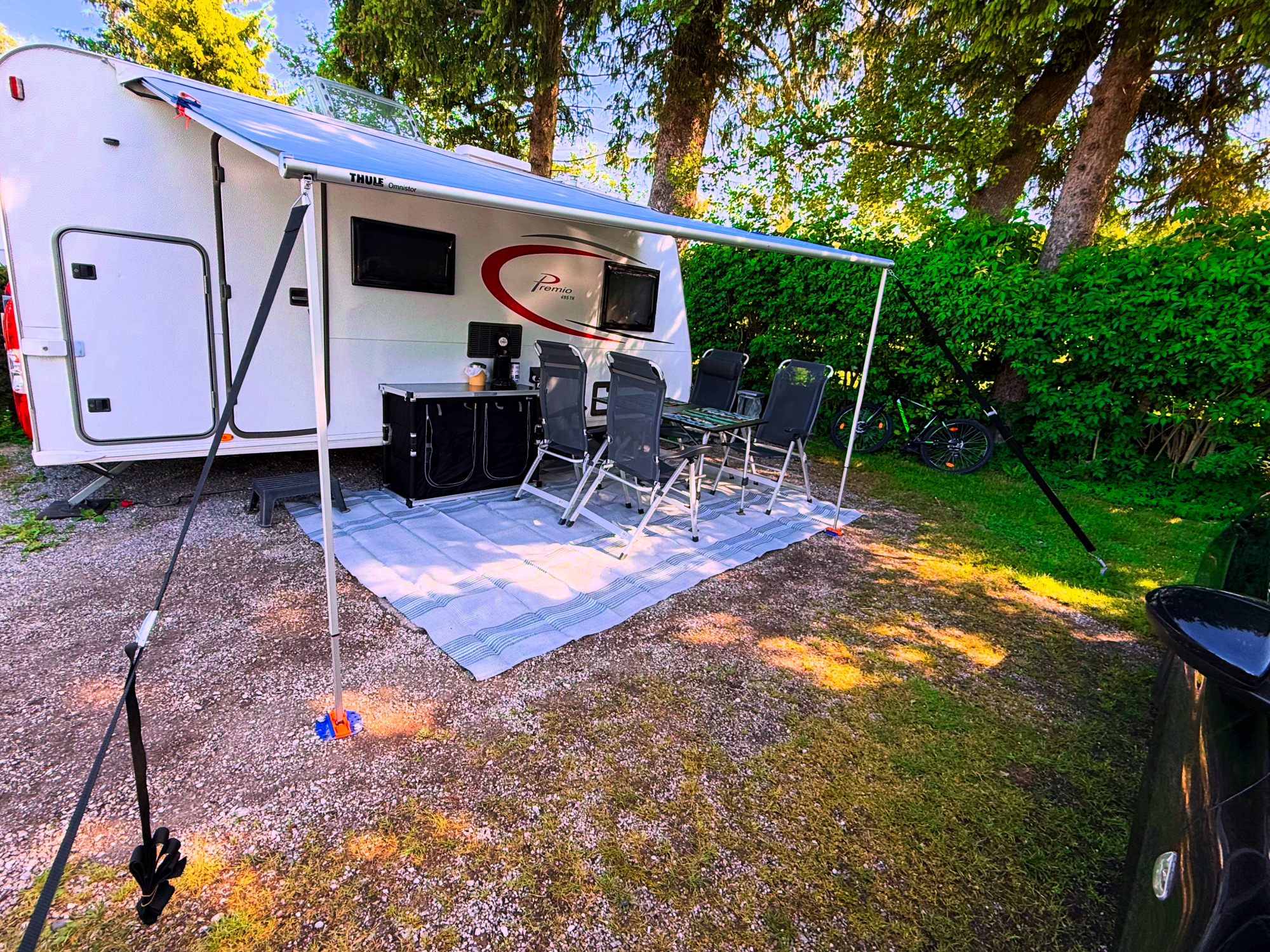 Unser Wohnwagen bietet nicht nur einen gemütlichen Innenraum, sondern hat auch eine praktische Markise, die einen schönen schattigen Platz im Freien schafft. Dieser Bereich ist perfekt für ein entspanntes Frühstück mit der Familie, für lustige Spiele oder einfach um die Natur in vollen Zügen zu genießen. Die Kinder können nach Herzenslust spielen, während die Eltern sich entspannt zurücklehnen – alles ganz nah am Wohnwagen und ohne zusätzliche Kosten. So macht das Camping einfach Freude!